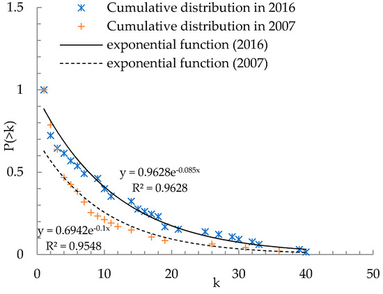 Cumulative degree distribution in 2007 and 2016.