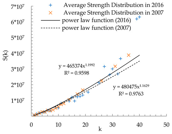 The cumulative degree distribution follows an exponential distribution, while the relationship between average strength and degree is subject to the power-law. According to the cumulative degree distribution function in Table 2, and have increased, which reflects that is increasing to the same degree, as shown in Figure 10. This indicates that the number of cities with a high degree is increasing. According to the function of the relationship between average strength and degree in Table 2, has decreased and has increased. Further, the strength and degree show a strong correlation, indicating that the more routes a city connects, the higher its passenger volume is, as shown in Figure 11. From Figure 11, we also find that the numbers of cities that are responsible for sending large numbers of passengers has increased. Based on a comprehensive analysis of the changes in these two functions, the trend of CMATN is to distribute large changes in passenger volumes from few to multiple cities. This also more intuitively explains the clustering coefficients’ decrease and proves that the hub-and-spoke system is being optimized.