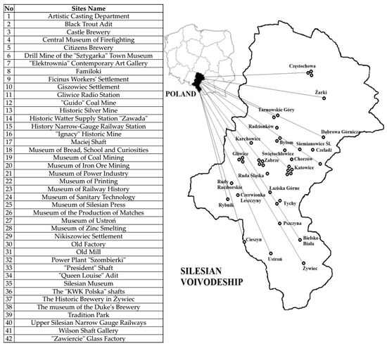 The interviews were made with the representatives of all (42) sites situated along the Industrial Monuments Route (IMR). Therefore, the research was comprehensive (it involved all sites). The rationale behind selecting this route is that it is the only route in Central Europe belonging to the European Route of Industrial Heritage (ERIH). It is also the largest tourist post-industrial route in Poland (in terms of the number of associated sites, which, at the time of the conducted research, was 42). The other routes in Poland comprise less than half of the IMR sites. They are also not as diverse in terms of the presented theme (they bring together sites of a single type, e.g., lighthouses, railway buildings, etc.) as the IMR, which includes sites such as mines, museums, factories, etc. Moreover, the IMR is characterized by a high level of development and formalization. The exact list of sites and the IMR map is presented in Figure 1. In the interviews, responses were given by people with senior managerial roles.