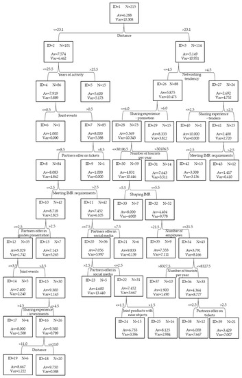 First the Classification and Regression Trees [33,34] (C&RTs) method was used to identify variables describing tourist sites, which allowed assessing the effectiveness of communication between any given pair of entities. This method differs from the frequently used approaches in tourist research when testing hypotheses and analyzing data [35] that is not overly complex and concerns a large amount of data [36]. The created model was used for estimating the effectiveness of communication for all possible combinations of pairs of tourist sites (in the study, each expert assessed this parameter for 9 of the 41 remaining sites).