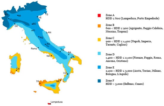 According to the Presidential decree D.P.R. 412/93 [9] and its subsequent modifications, the Italian territory is divided into six different climatic zones, depending on the value of the heating degree-days (HDD). This parameter is computed as the sum, throughout the entire heating season, of the positive differences between the standard indoor temperature and the daily mean outdoor air temperature. For each climatic zone, the current regulation provides various limitations on thermal transmittance of all the components of the building envelope, such as for windows, infill walls, slabs, etc. Moreover, the aforementioned decree states, for each zone, mandatory limitations about the duration of the heating season and the daily number of operations for the heating systems (Table 1). The Italian climatic zoning map is shown in Figure 5.