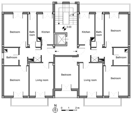 The building has four stories, with two apartments per story, a sloped roof, and no underground floor. The shape is rectangular, and measures 18.1 m by 11.8 m. The building hosts 8 apartments, with a gross and useful floor area of around 816 and 725 m2, respectively (Figure 7).