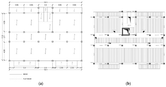 As a result of the design process, the structure is made up of twenty-six 30 × 30 cm columns, each of those reinforced with four Ø14 steel bars and Ø8 steel stirrups with a spacing of 20 cm. Only regarding the first floor, four of the twenty-six are 40 × 30 cm columns. The concrete slabs are all oriented in the shortest building-length direction (Y) and their three bays lean on two boundary 30 × 50 cm beams and two 100 × 20 cm flat beams. There are no beams in the other direction (Y), except the two boundary 30 × 50 cm beams. The stairs are realized with two jumping concrete slabs and a knee beam for the medium ramp. The carpentry scheme and plan are shown in Figure 9a,b, respectively.