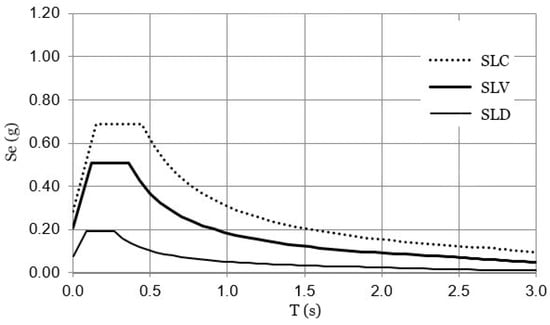 According to the Italian OPCM Ordinance 3519/2006 [29], the construction site (Nesima, Catania) belongs to the seismic zone 2, associated with high hazard levels, since the peak ground acceleration of the earthquake with a 10% probability of exceeding in 50 years is equal to 0.2066 g. The nominal lifetime VN of the structure is equal to 50 years. The topographic condition is T1 type (horizontal terrain or less-than-15° average inclination), while an A-soil type was considered. The spectra prescribed for SLD, SLV, and SLC verifications are shown in Figure 10.