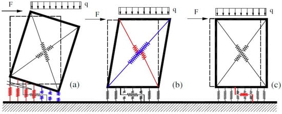 The aim of this study is strongly related to the investigation of an integrated seismic and energy renovation approach, considering a recent eligible material as AAC and applying a recently developed modeling method to take infill walls into account in the seismic assessment of RC framed structures with masonry infills. Recently, AAC has been studied by many authors, especially under the boost of its manufacturers, and very satisfactory performance results have been achieved [33,34], making it worthy of further study and applications. On the other hand, the seismic response of the infill walls was simulated by means of a macro-element modeling approach, as described in [35] and [24]: the infill walls are modeled by 2D geometrically consistent equivalent mechanical macro-models capable of simulating the in-plane nonlinear response of unreinforced masonry buildings [36], while the RC frames are modeled by concentrated-plasticity beam–column elements. In particular, the infill wall is modeled as a plane discrete element, with a quadrilateral shape, with rigid edges connected by four hinges and two diagonal nonlinear springs. Through this simple and realistic mechanical simulation, three main failure mechanisms can occur: the flexural, the diagonal-shear, and shear-sliding failure mode (Figure 11).