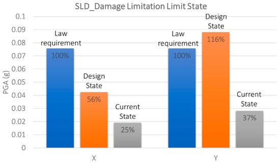 Starting from the damage limitation limit state (SLD), the proposed intervention involves the highest improvement over other performance levels. As can be seen from Figure 12, showing the PGA values when the direction changes in the considered cases, along the X direction, the PGA capacity of 0.0192 g is elevated to 0.0424 g, more than doubling (120.8%) the value of the capacity related to the achievement of the SLD. Nevertheless, this value still keeps below that required by the regulations in Nesima, Catania (0.0757 g). On the other hand, if one observes the PGA value for which the limit state is reached along the Y direction, it is evident that the upgraded structure entails an improvement (211.3%) that satisfies the regulatory requirements.