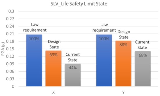 Regarding the SLV, there is also an improvement, although of smaller entity: in fact, the PGA that leads to the limit state reached a 57% increase, from 0.0911 g to 0.143 g (Figure 13). In this way, it is possible to satisfy about 70% of the regulatory request, thus not achieving a full seismic upgrading, but nevertheless guaranteeing higher levels of safety in the event of earthquake. Furthermore, a less dissimilar behavior is observed between X and Y directions.
