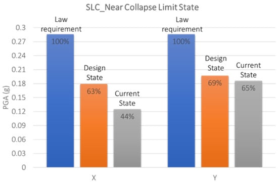 As regards the near collapse limit state (SLC), the slightest improvement is recorded: indeed, the PGA that leads the structure to SLC is higher by about 43.2%, passing from 0.125 g to 0.179 g. In this way, it is possible to satisfy about 63% of the regulatory request, certainly more than before retrofit (44%), but not high enough for the full seismic upgrading. Moreover, the structural behavior in the two X and Y directions is nearly the same, according to the PGA equal to 0.179 g and 0.197 g, respectively (Figure 14).