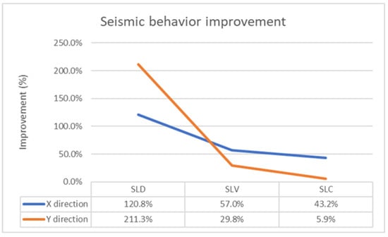 Another important remark is connected to the different improvement in X and Y directions, especially for SLD, where a significant improvement has been recorded in Y direction. It should be remembered that, in Y direction, the infill walls have a very low percentage of openings (less than 5%); for this reason, in fact, the building is particularly more resistant to horizontal actions in this direction.
