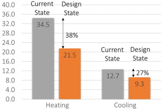 The main results of the dynamic energy simulations are reported in Figure 15. As a result of the final renovation solution, significant reductions in the energy demand for heating and cooling are observed, although for the latter, in the intermediate floors, savings are less substantial. Specifically, the total energy needs are reduced by 38% and 27% for heating and cooling (see Figure 16), respectively, with important consequences also on the reduction of greenhouse gas emissions. Moreover, after the proposed retrofit, the average heating and cooling needs for unit net useful surface are, respectively, 21.5 kWh m−2 year −1 and 9.3 kWh m−2 year −1.