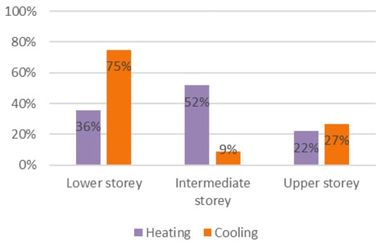 By looking in more detail at the behavior of the different floors, different trends emerge. In fact, as regards heating, the savings stood at 36%, 52%, and 22%, respectively, for the lower, intermediate, and upper stories, as shown in Figure 16. This trend can be justified by the greater impact of the external wall insulation. On the other hand, as regards summer cooling, the trend is reversed, that is, minimum savings are observed in the intermediate level (8.9%), while on the ground floor and the upper story there is a higher saving percentage: respectively, 75% and 27% (Figure 17).