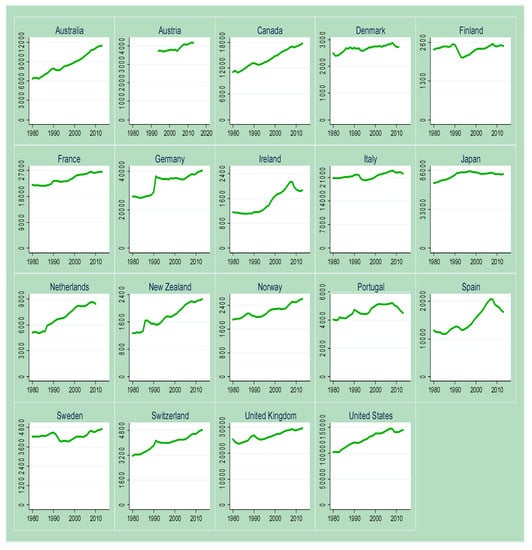 In this section, we seek to illustrate the time-series patterns of the two main variables of interest in our empirical analysis, namely employment and green energy supply across the 19 OECD countries under scrutiny over the 1980–2013 period. Figure 1 illustrates the dynamics of employment, in levels, over the time span considered.