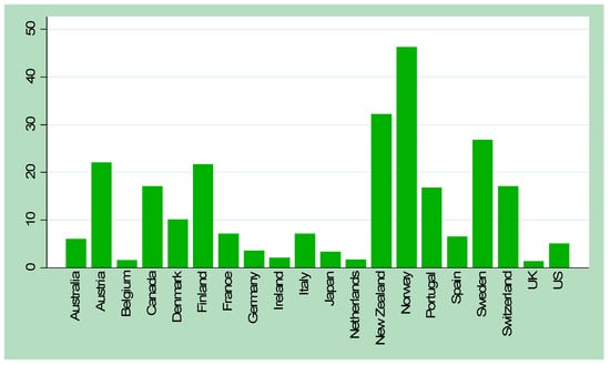 Although this marked increase shows the countries were unharmed by the crisis, it is possible to observe that large heterogeneity in the levels of green energies produced exists between the countries under scrutiny. To better capture these differences, Figure 3 provides a bar graph containing the average shares of green energies in the set of countries examined in the paper. In particular, these statistics reveal that the efforts in introducing green technologies were not uniformly distributed across countries and that, among OECD countries, Norway led in terms of green energies produced with a share of 46.28%, followed by New Zealand (32.23%), Sweden (26.78), Austria (22.06), and Finland (21.70).