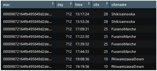 The data cleansing process was carried out in several steps. (1) Data integration of multi-location sensors: Although the reception coverage range of the used Wi-Fi packet sensor is 300–400 m, the reception of probe requests from the user may be difficult because of the surrounding environment, such as buildings, crowds, weather, and so on. For that reason, multiple sensor installations were required. Then, the received data at the plurality of locations were combined to obtain the aggregate data for a particular site. (2) Data extraction of arrival at and departure from sites: The original data consists of continuously received records that were captured at intervals of several seconds. Except for the recording at the time of initial reception (arrival) and final reception (departure) at a site, the recordings were unnecessary and excluded. (3) Exclusion of data from MAC addresses detected for ten days or more: Arrival and departure data were arranged in chronological order for each MAC address. The round-trip time of the user was obtained by taking the difference between the arrival at the first site and departure from the last site. A stay of more than ten days is likely to be a resident or a user for business purposes, so such data were excluded.