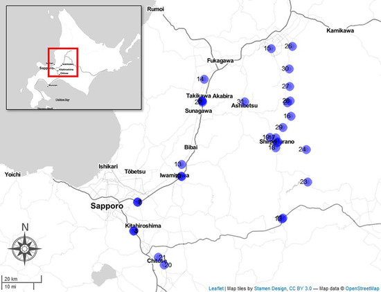 This research was conducted on specific target areas, and it involved traveler mobilities and activities in a massive region, namely, the central and northern regions of Hokkaido, as shown in Figure 2. Furano and neighboring cities have been recognized as flower garden areas that attract massive international and domestic tourists each year, especially during the lavender blooming season in June and July. Thus, the investigation period was from June 19 to July 23, 2017. Multiple Wi-Fi sensors were equipped in 31 different observation destinations. Besides this setup, multiple devices were placed in single areas in various facilities (e.g., buildings, farms, or gardens) located in the same area. The field experiment was conducted at traffic attraction nodes, such as the service and parking area (SA/PA) on a road network, as well as tourist attraction destinations, such as hotels, the zoo (AsahiyamaZoo), famous flower gardens, car rental shops, and recreation and shopping areas, as shown in Table 2.