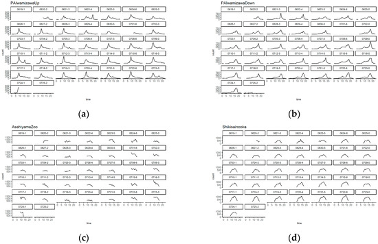 Since Wi-Fi tracking data were used to analyze visitors’ mobility in the study area, time series analysis was deemed a suitable method to clarify mobility patterns, which are expressed as the hourly and weekly demand at a particular attraction. The hourly demands at parking and service areas along the expressway network and at tourism destinations, both inbound and outbound directions, are illustrated in Figure 3a,b. The scanner devices captured the trace of visitors who spent time in the parking and service stations. The patterns show the visiting occurrence during the day between early morning and midnight, as public facilities and services are provided 24/7. For example, the inbound direction “PAIwamizaUp” rush hour appears during the morning for the starting stage of travelers’ journeys, while the outbound “PAIwamizawaDown” rush hour generates the reverse pattern because visitors are heading home at the end of the day.