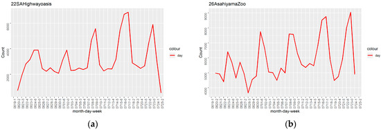 The weekly patterns of visits to attractive destinations are represented by a collection of destinations as an example. The outcomes of monitoring “SAHighwayoasis” and “AsahiyamaZoo” represent trends in the number of visitors in each week, including the weekly peak, during the months of observation. The figures show that the weekend generates a greater number of visitors than a weekday; also, the trends for a service and parking area (see Figure 4a) and an attractive destination (see Figure 4b) reveal similar results, with a both showing a significant increase in visitors on weekends.
