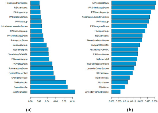 Mining the most attractive destination was performed by probe requests, and the dataset in this study includes 1,048,575 records and four attributes: MAC number, day, time, and site name. This section reports the mining of famous destination visits. The distribution of the transaction indicates the frequency of visitations to the destination, and the relative distributions in Figure 5 reveal the most popular and the least visited destinations. The lift bar chart shows the top 20 most visited sites, among which “AsahiyamaZoo” was the most visited, showing the highest visitor population; this is a reasonable finding since this is the most famous zoo in Hokkaido. Conversely, “LavenderHighlandFurano” was the least visited destination. Moreover, the plot shows that “AsahiyamaZoo”, “FuranoMarche”, and “Shikisainooka” had the most visitors when compared with other destinations. Hence, to improve the number of visitors to “FuranoChessePlant” or “FlowerLandKamifurano”, the planner or local tourism authorities could consider addressing the information related to the top destinations. Additionally, the trend bar charts will shift as a result of seasonality tourism [42]; for example, during winter, alpine ski resorts are likely to be more popular destinations than flower gardens.
