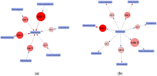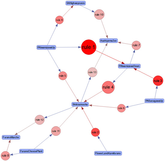 The rules present a pattern of destination visits, and the analysis considered transactions including two or more rules, i.e., rules with a length of one were excluded. The confidence threshold shows that about 6% of those who visited the parking area “PAIwamizawaUp” were highly likely to visit “PAIwamizawaDown”. Similarly, about 3% of those who visited “FlowerLandKamifurano” also visited “Shikaisainooka”, where there is a free-of-charge flower garden in the Furano area. Once the minimum confidence ratio is reached, it becomes a matter of focusing on rules with high confidence to identify the relationship between rules and destinations for development purposes. “Shikisainooka” seems to be a popular destination in this area, so it is relevant to find how it associates with other destinations, such as tourist and activity sites or even parking and service areas.