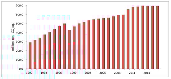 In accordance with the Paris Agreement, the following parties announced their GHG reduction targets to the international community as follows—U.S.: 28% relative to 2005 levels, E.U.: 40% relative to 1990 levels, Japan: 26% relative to 2013 levels, Canada: 30% relative to 2005 levels, and China: 60–65% relative to GDP per person in 2005 [5,6]. South Korea proposed its target emission level by 2030 as 37% reduction relative to business as usual (BAU) levels, which included domestic reduction of 25.7% and foreign reduction of 11.3% through international market mechanisms [7].