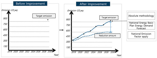 For emission factors, it is necessary to apply the country-specific emission factor. However, a country-specific emission factor for a non-CO2 emission factor is absent for South Korea, requiring the IPCC factor to be applied, and, unlike CO2, it is necessary to apply emission factors separately for residential and commercial applications. Among energy sources, the emission factor for heat energy is converted to CO2eq value, and, thus, non-CO2 values are not available. Korea’s reduction target needs to be improved as shown in Figure 4. Figure 4 shows an example after improvement.