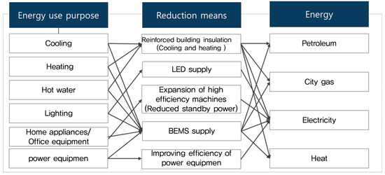 Above all else, reduction in energy use is needed for overall GHG reduction. Secondly, reducing GHG emission factors of energy is needed. However, reducing GHG emission factors is very difficult due to the specific heating value of energy. Since GHG emission reduction is possible through energy saving measures, the present study derived a GHG reduction method for the building sector by analyzing energy use in buildings by purpose of usage [26,27]. The results of the analysis are shown in Figure 5. For energy use in buildings, a reduction method needs to be presented according to purpose of usage, such as cooling/heating, hot water supply, lighting, home appliances and office equipment, and power generation [28,29]. Moreover, analysis showed that energy could be reduced by reduction method that may then be used to estimate the total reduction amount [30,31].