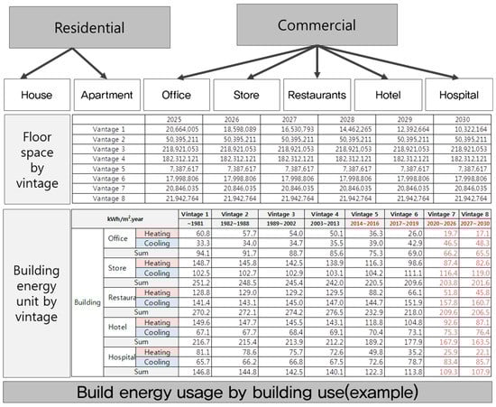 Floor area statistics in Korea are statistics based on the building master. Area statistics can be collected through Korea National Statistical Office Online. Floor area statistics do not provide yearly data for building dates. However, since the amendment of insulation performance is not an annual change, there is no difficulty in estimating GHG emissions. The use of vintage energy consumption data by building use can be done by studying ’building a standard model Data Base for analyzing the GHG reduction potential model for buildings’. In this study, the buildings were separated into home and commercial, and the energy consumption of the vintage cooling, heating, and hot water supply of the building was derived. It includes information on standard energy use of cooling, heating, and hot water in Korea. The methodology for estimating cooling and heating energy reductions can be estimated using the methodology shown in Figure 6.