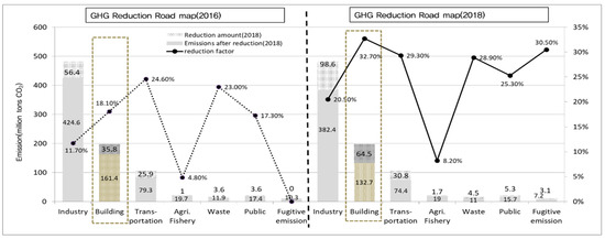 Consequently, in June 2018, South Korea announced a new version titled “Revised Roadmap for Achieving Greenhouse Gas Reduction Targets by 2030.” Analysis results showed that the total national target emissions amount for 2030 was 851 million tons of CO2eq, which was the same as the amount given in the roadmap announced in December 2016. Moreover, the target emissions amount for the building sector was 197 million tons of CO2eq, which did not change from the 2016 report, but the reduction target was increased significantly from 18.1% to 32.7%, as shown in Figure 2. Overall, the reduction target was increased, but the GHG reduction target for the building sector was set higher than all other sectors.