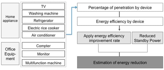 In the case of domestic-use products produced in Korea, it is possible to construct data on the basis of the logarithm of the shipments from the factory. In addition, Korea’s electronic products have been certified for energy efficiency, and all products produced are being verified. It is necessary to construct information on the number of items shipped by product type in future. The method of calculating energy reduction amount of Home Appliances and Office Equipment energy can be calculated by the methodology shown in Figure 8.