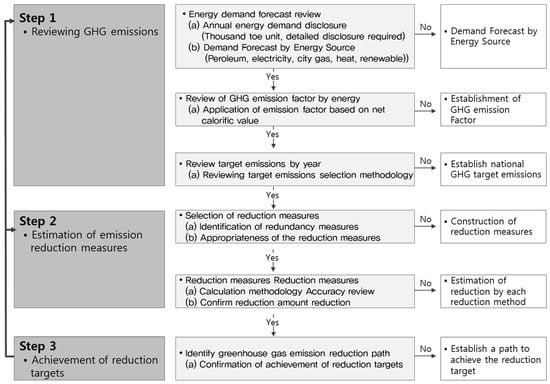 However, this study proposed a methodology that can be used generally in countries other than Korea, as shown in Figure 10. Country-specific target emissions and target reductions are different. However, it is possible to review the appropriateness of the target of reducing GHG emissions by country in the method of Figure 10. The review of appropriateness can be done in three stages: Reviewing the appropriateness of the target emissions, estimating the amount of emission reduction targets, and achieving the reduction targets.