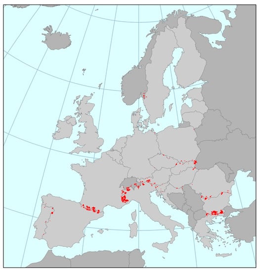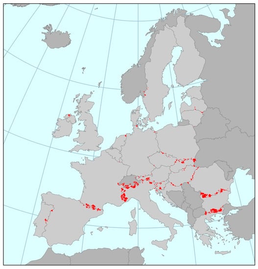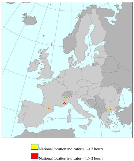 As an example, the zones with an international location indicator higher than 2 h can be seen in Figure 1, with a comparison of the national location indicator for the same cells. Cells with high values on both sides of the border (in red) are probably isolated because of the morphology of the area, such as the Alps, the Pyrenees, and the Rodopi ranges. The points on the Bulgarian-Romanian border are the result of the lack of river crossings over the Danube.