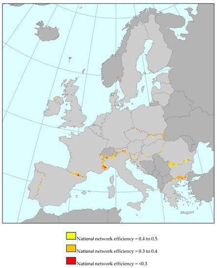 The concentration of zones with low values for network efficiency on both sides of the border is evident in Figure 3. Virtually all cells with a low value (<0.3) on the international side have a value lower than 0.5 on the national side as well. The combination of the location of those zones with the elevation map of Europe supports the hypothesis of high concentration on specific borders. Moreover, most of the zones with values lower than 0.3 on both sides of the border (red point on map) are located in mountainous areas.