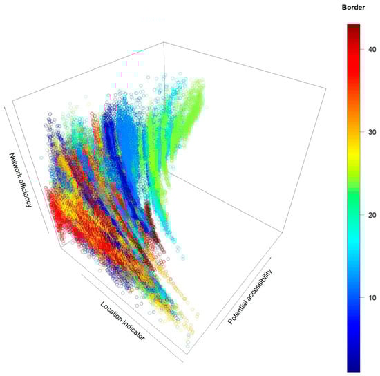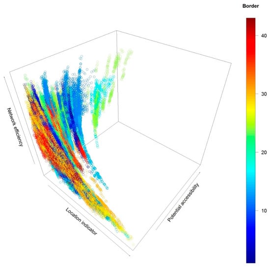 The three indicators present low levels of correlation, both at cross-border (Figure 4) and national (Figure 5) level. The cross-border side of all three indicators has a higher variation than the respective indicator at national level (Table 1). Nevertheless, while high levels of network efficiency are uniformly spread across various levels of potential accessibility and location indicator levels at national level, the cross-border distribution is much more unbalanced. A relatively small number of cells present high network efficiency, high potential accessibility, and low location indicator (for which low values mean low average travel times) on either side of the border, with the majority corresponding to the national side. These zones correspond to border regions with easy access to highways, are close to large settlements on the other side of the border, and have access to a considerable size of population within 75 km. This is the case mainly for zones on the Netherlands-Germany border. On the other extreme, a relatively large number of zones are considered isolated according to any of the three indicators (i.e., lower values of network efficiency and potential accessibility, higher values of location indicator). The share of zones with such values at national level is considerably lower, confirming the hypothesis that in general, cross-border accessibility is lower than accessibility at national level.