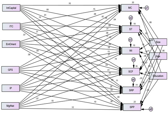 Cronbach’s Alpha of the factors was executed to test the inside steadiness of the items that were loaded on each factor. The value of reliability is recommended above 0.70 [73]. However, Taber [74] also claimed that a reliability value greater than 0.65 also indicates acceptable consistency. Based on these suggestions, our items were reliable as all the factors had satisfactory reliability values, as shown in Table 5: intellectual capital (0.65), ITC (0.67), entrepreneurial orientation (0.70), government financial support (0.70), managerial networking (0.78), institutional pressure (0.71), managerial commitment (0.78), safety training (0.73), worker involvement (0.73), safety communication and feedback (0.70), safety rules and procedure (0.73), and safety promotion and policies (0.71).