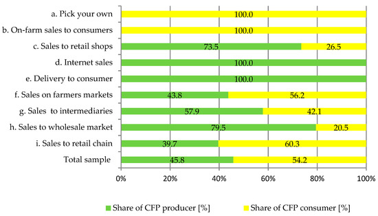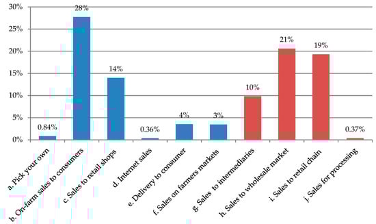 Short food supply chains are those marked with letters ‘a’ to ‘f.’ There are no intermediaries in the chains: pick your own and (a), on-farm sales (b), Internet deliveries (d) delivery to consumer (e) and sales on farmers’ markets and food fairs (f). There is one intermediary in sales to retail outlets (c).