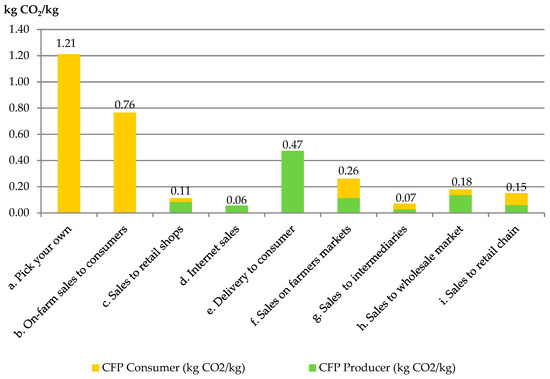 The reason for a relatively high consumer contribution to generating CFP (Figure 2 and Figure 3) in the case of almost all chains, (with the exception of Internet deliveries and direct delivery to consumer) is the fact that consumers usually buy small quantities of products most frequently using cars. Even if we take into account that consumers travel relatively short distances emissions from this type of transportation per unit of product are very high. This is particularly evident in the case of on-farm sales and pick-your-own chains, where the consumer is responsible for all the distance travelled by the product, which makes optimizing transport in terms of quantities transported impossible. It should be emphasized that, in our estimates, the distances travelled by individual consumers were strongly reduced through several assumptions made regarding shopping when passing-by (e.g., tourists, consumers travelling home from work, etc.) or joint purchases of products other than the specific type of food. The assumptions were based partially on information collected from surveyed producers but also from consumers interviewed in our parallel qualitative survey [48].