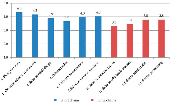 Considering the differences across chains, it could be observed that some of the short chains (pick-your-own and internet sales) were evaluated much lower than the others. Pick-your-own and internet sales chains were poorly evaluated due to small quantities bought by consumers and the occasional character of these purchases, compared with the other short chains. In contrast, sales to retail chains and processing were evaluated highly on average, mainly due to appreciation of the large quantities sold and regular and assured payments received by farmers.