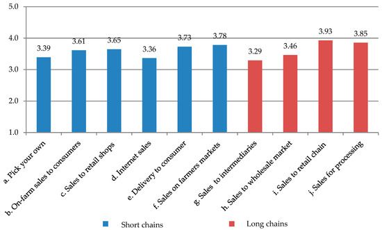 In the group of ‘long’ chains (g–j), which serve in the study as a reference for comparisons with SFSCs, there are four distribution channels with two or more intermediaries. Three intermediaries may be identified in the chains ‘on-farm sales to intermediaries (an agent purchasing product-wholesaler or wholesale market-retail outlet)’ and ‘sales to retail chain (farmers’ co-operative-logistic center-hypermarket),’ both of which are commonly used in the fruit market in Poland.