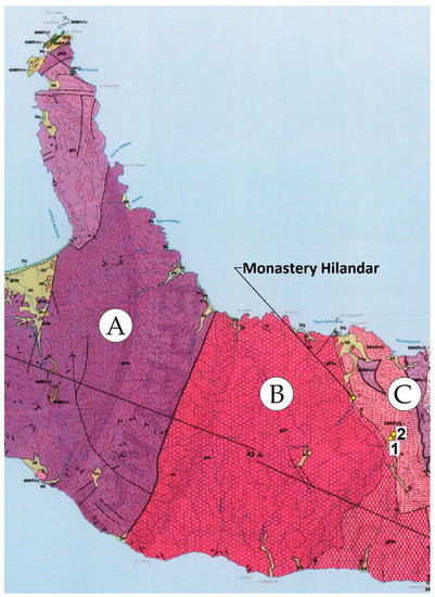The geological map of the property of the Hilandar Monastery [23]: (A): Rocks of granite group, (B): Rocks of gneiss group, (C): Rocks of ophiolitic mélange group; 1. 2—places where sample 1 and sample 2 were taken.