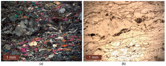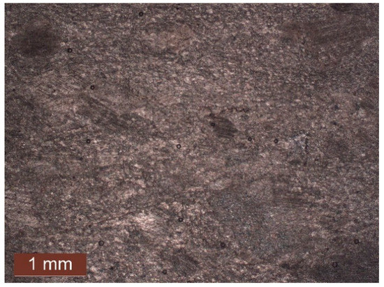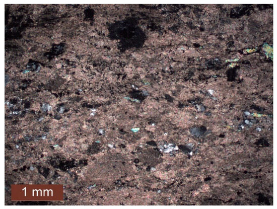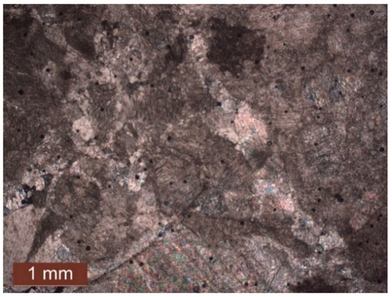 The stone outer walls of the Haybarn Complex were built from solid and schistose marble. Sample 1 was taken from the source/ledge near the road in the immediate vicinity of the Monastery (Figure 1). It was established through petrographic analysis that it was formed from densely packed carbonate grains of platelet habitus (Figure 5). In some parts of the sample, it was observed that the rock mass was permeated with post-metamorphic calcite veins. This marble contains a detrital component in the form of very fine grains of quartz and mica, as well.