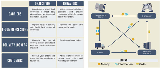 For the construction of the model, information about the behavior of the agent that performs an action was necessary, which then generates the outputs that allow the scenarios to be analyzed. This information was obtained directly from Ebit data [1] and from the research done by Oliveira et al. [11], as well as directly collecting information from transport service providers in the studied area, and indirectly based on data obtained from the literature review. The model considers the interaction of the four main agents involved in the e-commerce delivery process: (i) carriers; (ii) e-commerce stores; (iii) DLs; and (iv) customers. The modeling of each agent is presented below.