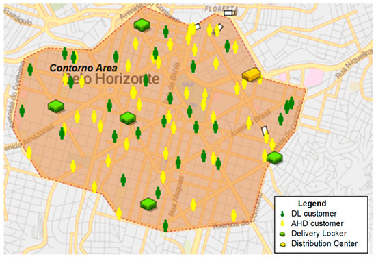 The Contorno region has about 93,684 inhabitants [41]. As stated by Oliveira et al. [11], the percentage of customers that make online purchases is around 30% of the population or 28,400 people. In this model, residences for these 28,400 customers were located within the Contorno region. Geographically, these residences were placed in a homogeneous manner throughout the region. The model initiates at the moment in which customers place an order and choose to receive their merchandise at home or in a DL. The software separates customers randomly, respecting the adopted parameters. Since there were no operating DLs in the region, we estimated the number of customers that would be willing to use DL based on Reference [11], where the authors reported that 43% of e-shoppers in Belo Horizonte would like to use this type of the system; in our model, we assumed this percentage of DL customers.