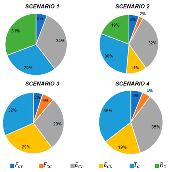 The sub-item costs which were most expressive in total costs were related to time and external costs, as can be seen in Figure 3 and Table 8. Time costs were reduced with the implementation of the DL, as there was a consolidation of deliveries. However, the total external costs (ECT + ECC) tended to be higher with the implementation of DLs in scenario 2 and scenario 3, where this value reached 17% higher results. This is because, in scenario 3, customers travel longer distances to get their orders in the DC, which are usually located in regions far from residential areas, thus encouraging the use of motorized modes. It can be observed that the distance traveled by AHD customers contributes a great deal to external costs in terms of external costs to the trucks and contributing to exceeding the fuel costs of the trucks by 24% in scenario 3. These results are similar to those found in Edwards et al. [42], where the authors still pointed out that it is unlikely that, under these conditions, a modal shift would occur due to the location of the DC.