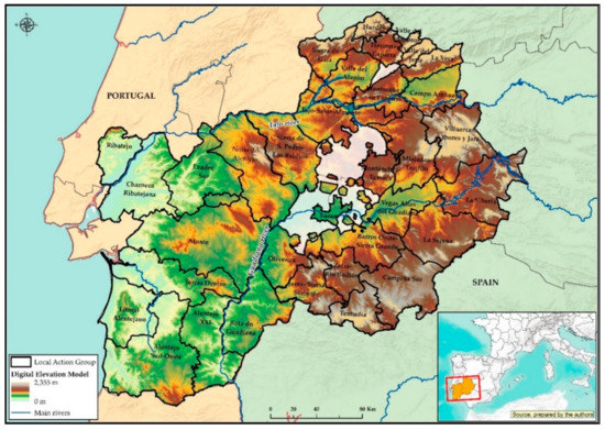 The LEADER Approach is a model of good practice for public and private initiatives [5]. Its main purpose is to diversify production, increase competitiveness, and maximize human resources through increasing the power of local communities [6] with the creation of Local Action Groups (LAGs). LAGs are associations formed by local councils, cooperatives, entrepreneur groups, associations, and local self-employed individuals. They implement the local development strategy of their territory [7] by designing and executing the activities that it finances [8]. Nowadays, there are 24 LAGs in Extremadura and 10 in Alentejo.
