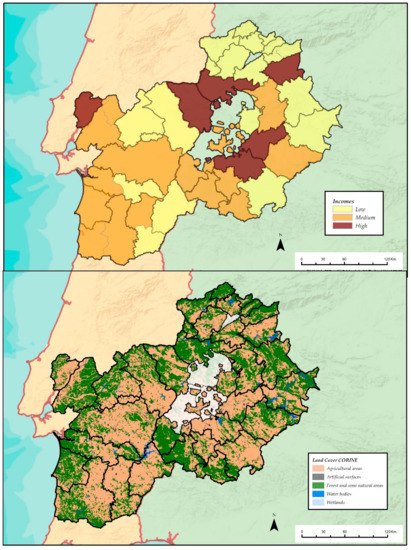Contextual economic indicators: income and land uses. Source: The authors from National statistical Institutes from Spain and Portugal and Corine Land Cover 2012.