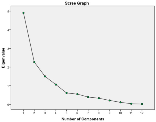 The high value of explanation of the first component must also be noted, which defines the different behaviors of LEADER with 40.87%. This is bolstered by the Scree graph (Figure 4), in which the eigenvalues related to each component are represented [46]. The turning point, at which the slope changes from being pronounced to a minimum, is taken as a signal of the number of components to be extracted (components whose eigenvalues are greater than 1). In this case, the slope starts to be subtler for Components 4 and 5, but a greater change is seen in the second one.