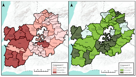 In Table 4, the explaining factors of the variables in Component 1 are recorded and the LAGs of both territories are represented on a map with respect to it in Figure 5. Then, Components 2 and 3 are symbolized “on the territory” to reinforce the results in Figure 6.