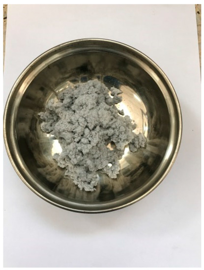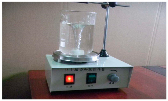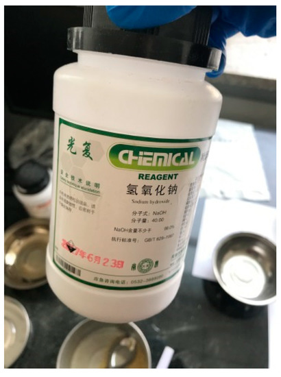 A 40 g sample of the final comminuted corn stalk fibers was immersed in 1000 mL sodium hydroxide solution with a constant concentration by mass [19], and the reaction between the fibers and sodium hydroxide was carried out with a magnetic stirrer (Figure 8) at a rotational speed of 2000 rpm for a fixed time at a constant temperature. Particles of a sodium hydroxide reagent (Figure 9) were used during the preparation of the corn stalk fibers. These particles were white, transparent, granular, and highly corrosive. The sodium hydroxide content in the reagent was not less than 98.0%. After the reaction was completed, the reaction mixture was rinsed with a large amount of deionized water, and the product was finally dried at a temperature of 110 °C in an oven to a constant weight to obtain corn stalk fibers suitable for asphalt pavement. The physical and chemical processing of corn stalk fiber is shown in Figure 10.