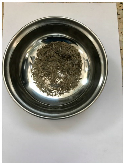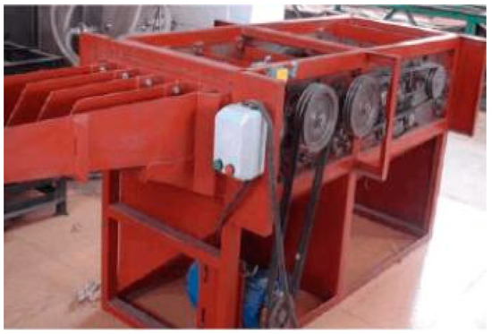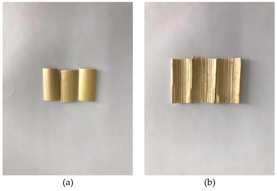 Firstly, selected corn stalks were subjected to a rind–pith separation process using a rind–pith separation instrument (Figure 4) [18], and then the corn stalk rind that was obtained was washed with water. Next, the cleaned corn stalk rind was dried in an oven to a constant weight at a temperature of 70 °C. An example of the corn stalk rind is shown in Figure 5.
