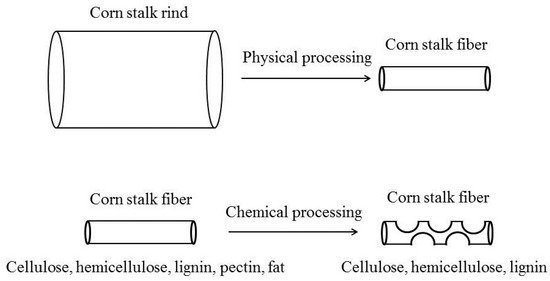 Corn stalks are composed of rind and pith. The pith of corn stalks is rich in protein, fat, hemicellulose, and sugar [15], whereas the main components of corn stalk rind are cellulose and lignin, which have high strength and toughness [16]. Corn stalk rind is used for the preparation of corn stalk fiber-based composite materials [17]. Because the pith of corn stalks is loose and has poor strength, it must be removed when preparing corn stalk fibers. Otherwise, it is difficult to achieve suitable mechanical properties.